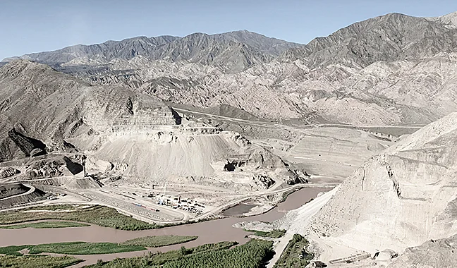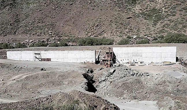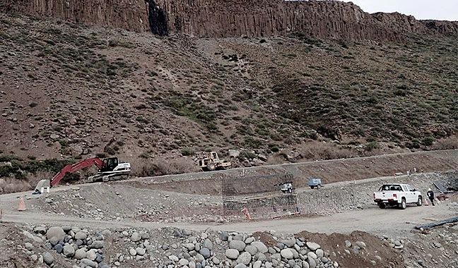 Detalle: La presa se elevará 83 metros de altura sobre el cauce del río y 113 metros desde su fundación en la roca. Alcanzará una longitud de coronamiento de 450 metros y tendrá un volumen de 7.894.964 m³ de relleno de materiales aluviales y una cara de hormigón de 76.000 m². El aliviadero de crecidas, ubicado en la margen derecha, será libre con un vertedero de 250 m totales de longitud y podrá evacuar una crecida de diseño de 3.200 m³/s. La conducción del agua hasta la casa de máquinas se materializará con un túnel dentro del macizo rocoso de sección circular de 5,70 m de diámetro y 2.700 m de longitud con chimenea de equilibrio y tubería de acero a presión en su tramo final antes de llegar a la casa de máquinas donde se alojarán los generadores.
